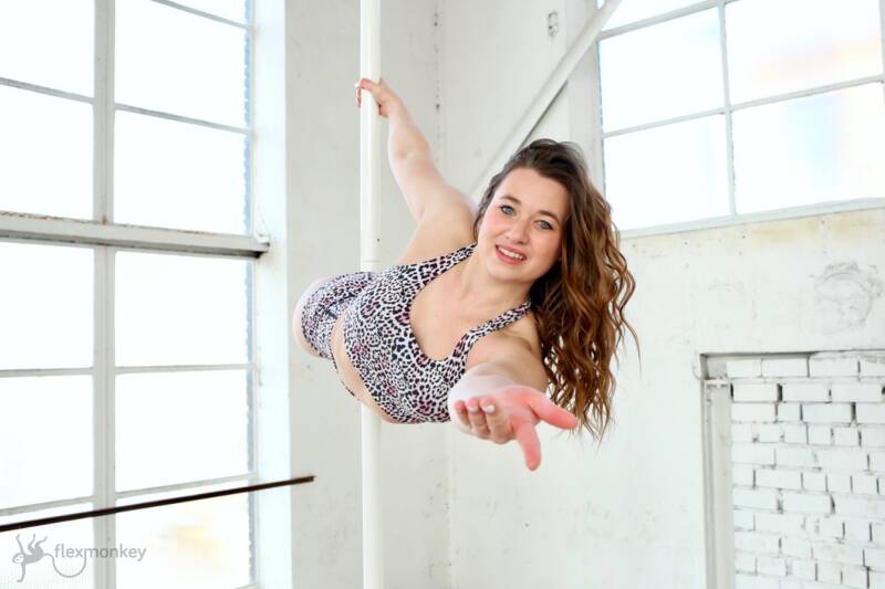 Het model in de foto hieronder is Demi Brama, Nederlands kampioen in de discipline Pole Sports, Artistic Pole, Aerial Hoop Sports én Artistic Hoop.